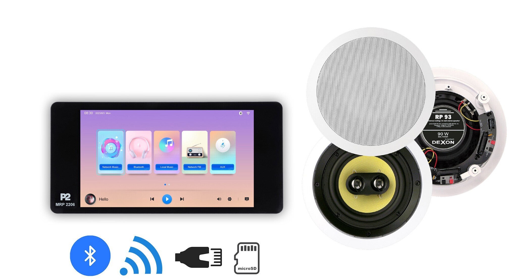 Zestaw nagłaśniający składający się z odtwarzacza ściennego ze wzmacniaczem MRP 2206 oraz głośnika stereo wysokiej jakości RP93. Zestaw doskonale sprawdza się przy nagłośnieniu mniejszych pomieszczeń jak pokój, przedpokój, toaleta, kuchnia, garderoba, gabinet zabiegowy, mała salka w kawiarni czy restauracji.